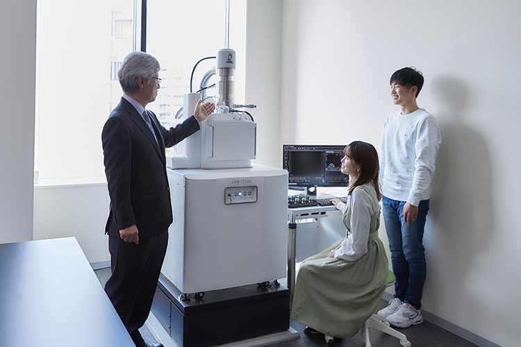 2020年開設の理工学部棟には、最先端の研究に取り組むための最新鋭の設備や高性能の機器を導入しています。また、生物生命科学、数理科学、機械システム工学、電気電子情報工学、建築学の異なる5専攻の学生と教員がお互いのコミニュケーションを深め、新しい発想が創出できるよう工夫されています。
