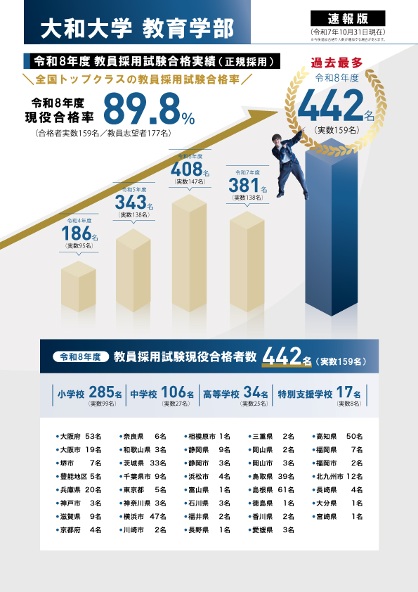 HOME > 大和大学入試情報サイト[Be:大和] > 受験生サイト:ニュース > 速報!教育学部教員採用試験現役合格者数が過去最多を記録!