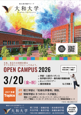 <2026年度> 春のオープンキャンパス イベント詳細 開催予定 2026年3月20日 カテゴリ 受験生の方, 教育関係の方 2026年度の「春のオープンキャンパス」を開催します。 皆様のご参加を心よりお待ちしております。 詳細および参加お申込みについては、入試情報サイトをご確認ください。