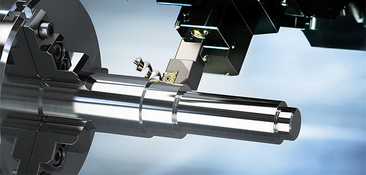 金属部品を回転させて表面を削り取り、下図のような回転形状部品を加工する工作機械です。コンピュータ制御で作動し、複雑な形状をもつ軸を加工することができます。自動車や電機製品の部品の加工に使用されます。