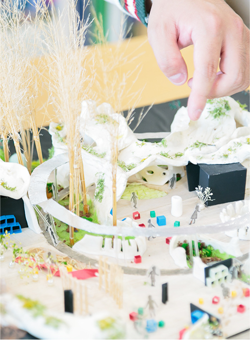 コンペに挑むにあたって、大和大学の大きな強みは、指導教員の手厚いサポートが受けられること。包先生は、アイデアから図面、プレゼンシートの構成まで、毎回細かくチェックしてくれます。また、図面の作成や模型の製作には膨大な時間がかかるのですが、理工学部の学部長の働きかけによって、深夜まで大学に残って作業できるようになったのも魅力。A0サイズの大きなプレゼンシートを無料で印刷できるのも、かなりありがたいです。