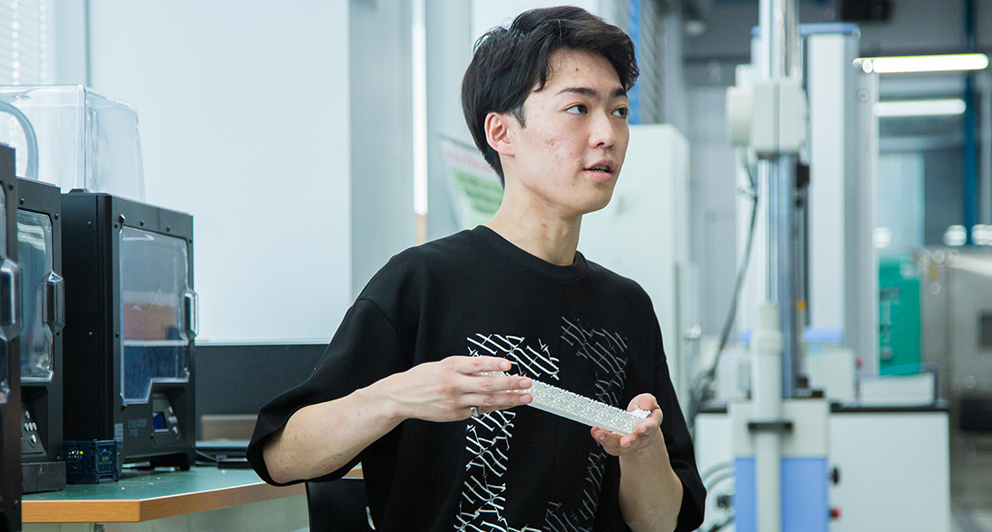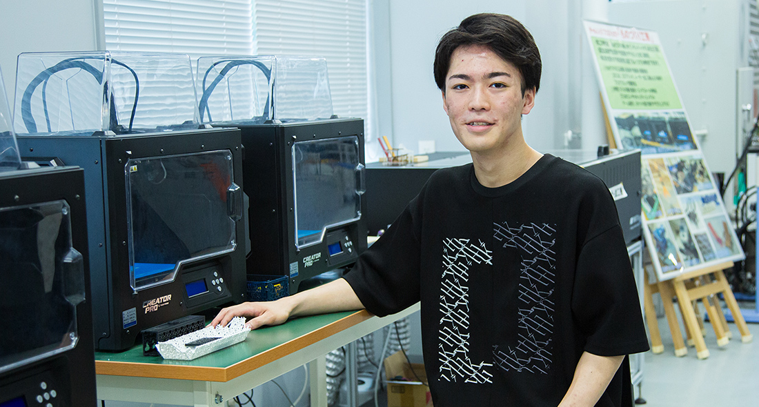高校時代は漠然と、カタチに残るモノをつくる仕事に就きたいと考えていた。新しい大学で施設が新しく、学びやすい環境に惹かれ、大和大学へ進学。1年生の頃に理工学部の「ものづくり工房」に参加したことがきっかけで3Dプリンタに興味を持ち、クリエイティブ活動をスタートさせる。