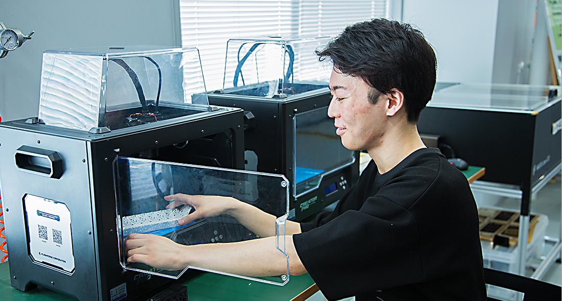 3Dプリンタは、パソコンでデザインしたものを、立体物としてプリントアウトできる機械です。頭に思い描いたイメージを具現化していけるのが、とてもおもしろい。初めて自分が手掛けたものが形になり、それを手にしたときの喜びは今でも忘れません。