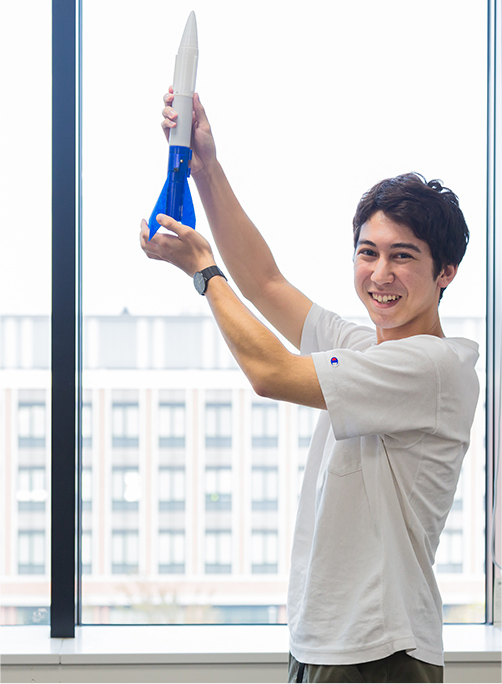 もともとロケットや宇宙に興味があり、何かを自分で作り出したいと思ったため、理工学部のプロジェクトのひとつ「ものづくり工房」のロケット班に参加することにしました。現在は学生代表として、大まかな活動の指針を決めたり、ロケットの設計をしたりしています。