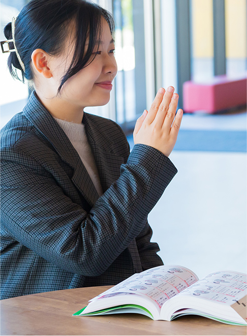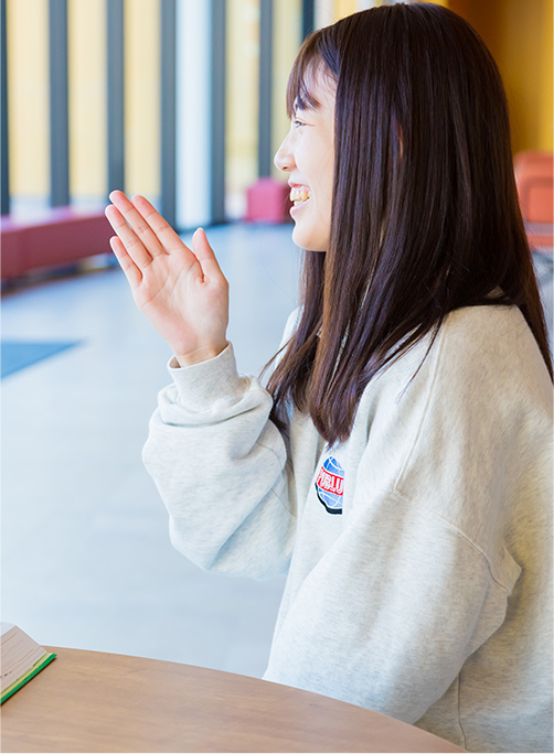 教師を目指している私にとって、手話を学ぶことは、聴覚障がいのある子どもや保護者とスムーズにコミュニケーションを取るために有効。また、言葉を発しにくい児童と接する際にも、役立つかもしれません。これからも手話のスキルをさらに高め、より多くの場面で活用できるように学び続けたいと思っています。