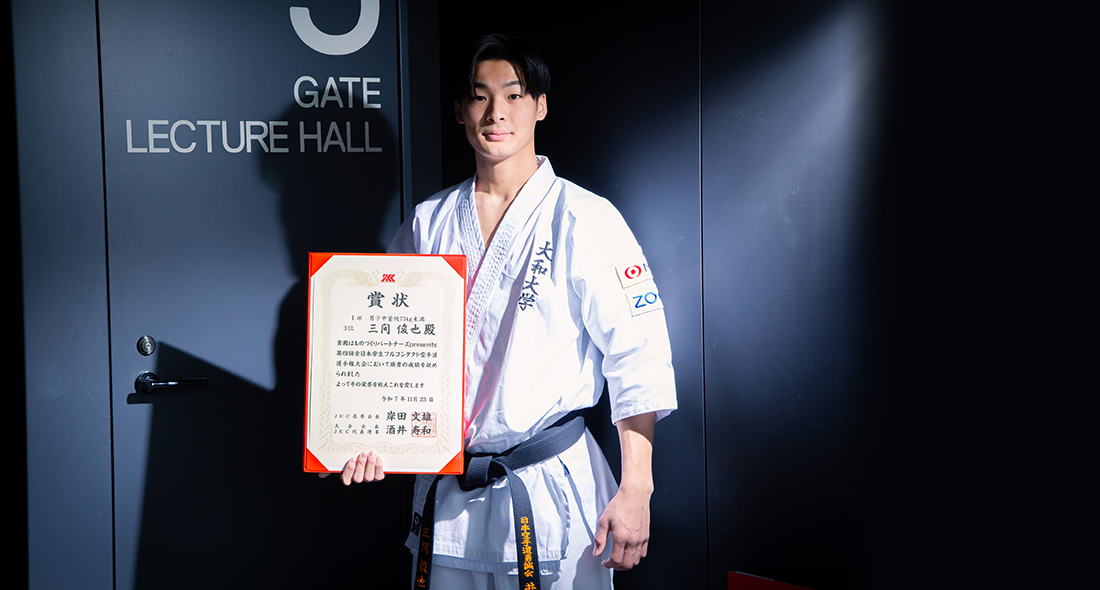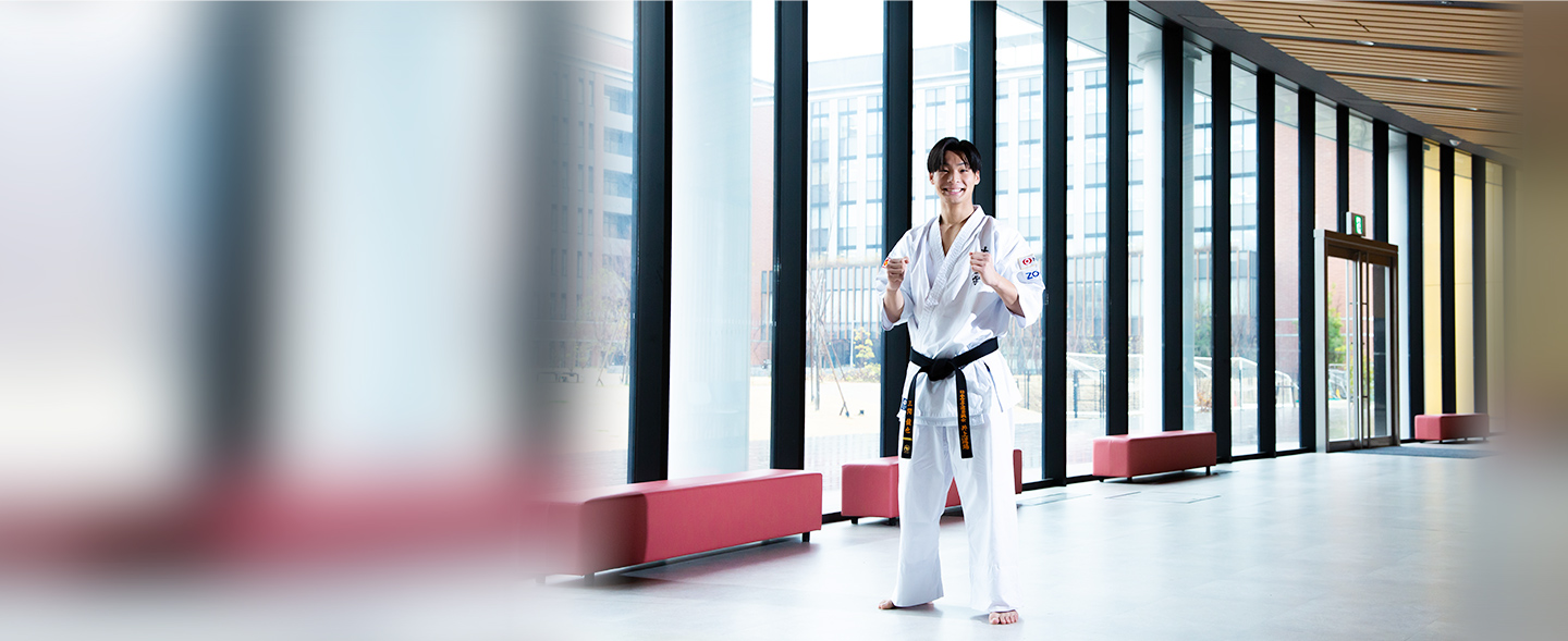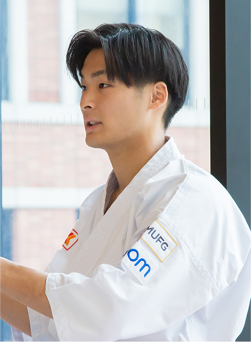 大和大学は先生との距離が近く、相談しやすい環境が整っています。競技を続けながらでも、ゼミや就活のサポートもしっかり受けられました。大学の道場を自由に使えたことも、成果につながった要因の一つ。午前中に自主練を行うなど、自分のペースで練習できたので、課題にじっくり向き合うことができました。好きな時間帯に集中して練習できる環境と、周囲の理解があったことは、大きな支えになったと感じています。