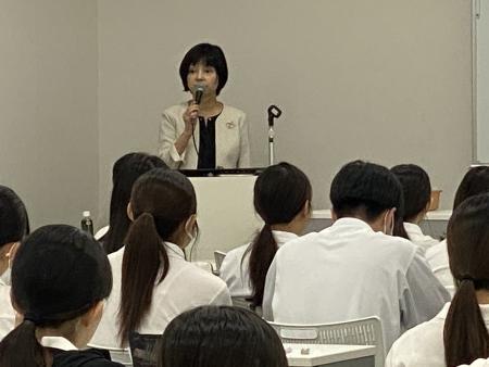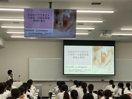 熊谷先生が人生をかけて取り組まれています「口唇裂・口蓋裂児と家族への看護」をはじめ、様々な専門分野のスペシャリストの方々がいらっしゃいます。熊谷先生はこの度起業をされ、さらに活躍の場を広げていらっしゃる姿は、学生にとって大きな刺激となりました。今回の講義を聴講し、目標を持ち将来のスペシャリストをめざして日々努力を重ねることの大切さを改めて胸に刻みました。「確実な技術」と「心のケア」の両輪を高いレベルで実現するために、学生たちは今後も専門的な知識と実践力を高める努力を続けていくでしょう。