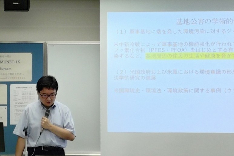 本学情報学部の村岡敬明准教授が2025年9月26日、大阪公立大学大学院都市経営研究科の都市行政ワークショップ(於:大阪公立大学梅田サテライト)で講演しました。テーマは「沖縄における基地公害補償をめぐる日米交渉―嘉手納基地燃料流出事件を中心に―」。1967〜68年に沖縄の米軍嘉手納基地で発生した航空機燃料流出事故を事例に、米軍統治下における環境汚染と補償交渉の実態を詳細に分析しました。