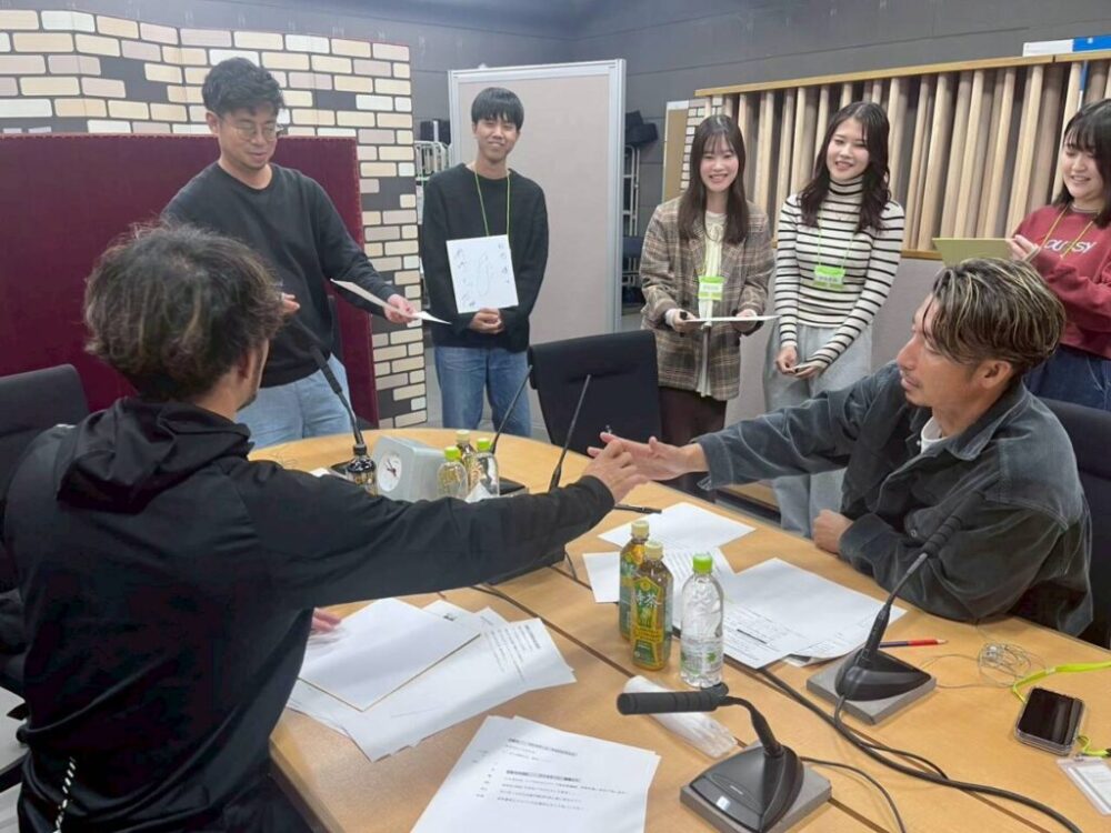 番組収録の様子は、社会学部メディア社会学コースの学生4名も見学し、鳥谷さんや狩野さんが展開する軽妙なトークをスタジオから見守りました。4人は佐々木教授のゼミに所属しており、将来、メディア関連業界への就職を志望していることから、今回のスタジオ見学は「貴重な体験だった」「大手ラジオ局の番組作りの実態が学べた」と話していました。