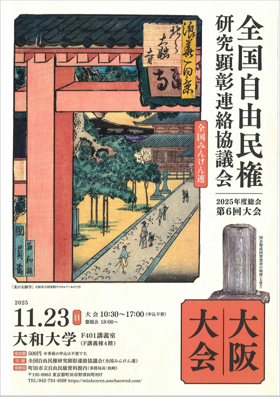全国自由民権研究顕彰連絡協議会(以下、「全国みんけん連」)主催の2025年度総会(第6回大会)が、11月23日(日)に本学で開催されます。
