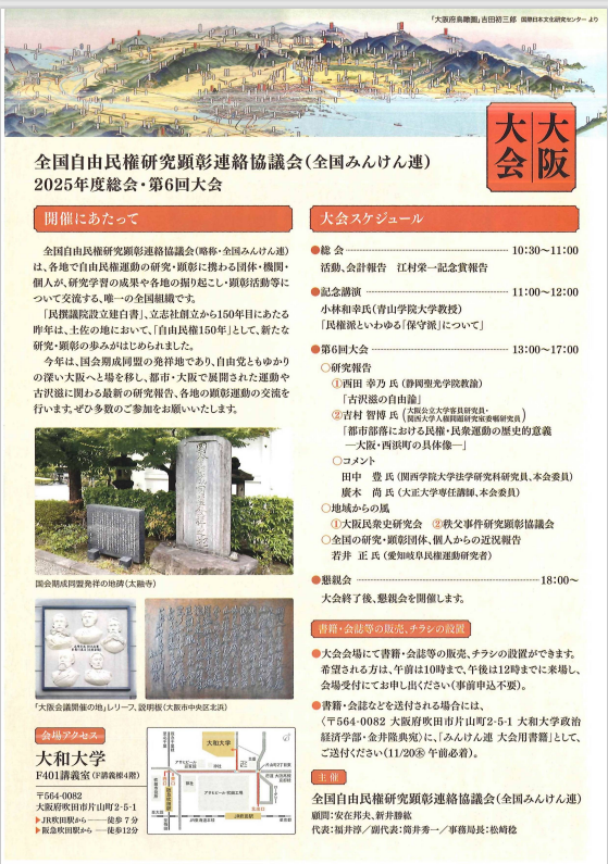 今年度の総会は、自由民権運動に大きな位置を占める国会開設請願運動を担った全国的組織「国会期成同盟」発祥の地で、自由民権運動の中核を担った日本最初の政党・自由党ともゆかりの深い大阪において、都市・大阪で展開された運動や古沢滋に関わる最新の研究報告、各地の顕彰運動の交流を行います。一般の方も参加可能ですので、ぜひご参加ください。(事前申込は不要ですが、参加費として500円が必要です)