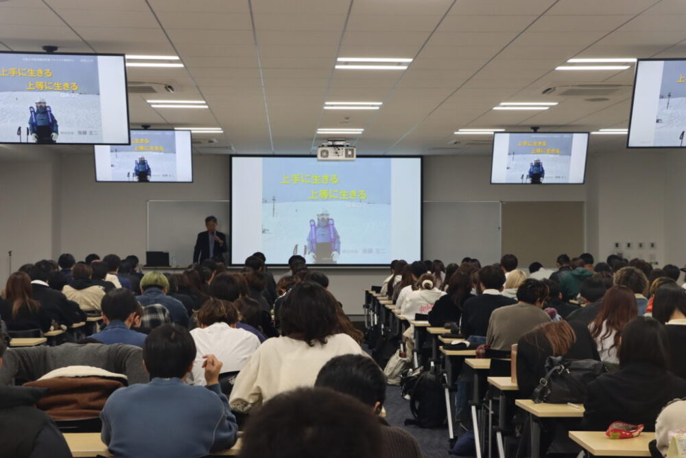 講義の前半は、「上手に生きる、上等に生きる」と題し、大学生の間に知識と知恵を身に付け、どのように生きるかを決めることが重要であり、「耳にした話を“謙虚“に鵜呑みにせず、話の裏をとる」「分析の癖をつける」相手の立場に身をおく、俯瞰する、「成功体験ではなく体験数こそが重要」など、貴重なアドバイスをいただきました。