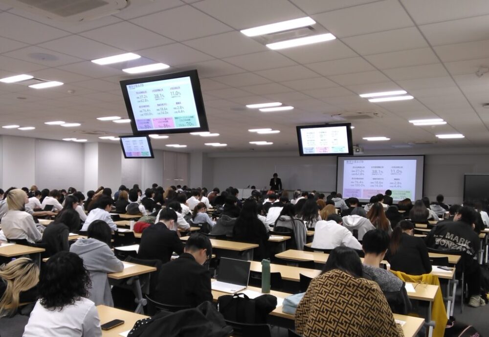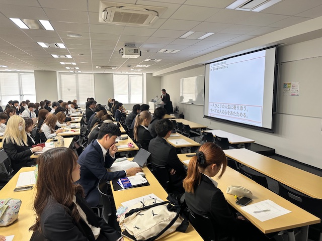 11月17日(月)には、株式会社JTB執行役員 西日本エリア広域代表の北村豪氏をお迎えしました。社会学部2年生207人が「JTBのビジネス」をテーマに講義を受け、北村氏からはツーリズム産業の概略と、該社の歴史から見る事業の変遷についてお話をいただきました。そして、コロナ禍を経た現在、単に「旅行」を扱うのではなく、交流創造事業として「心が動く瞬間を紡ぐ」新しい価値の創設に力を入れるという、JTBグループの新たな戦略についても紹介いただきました。