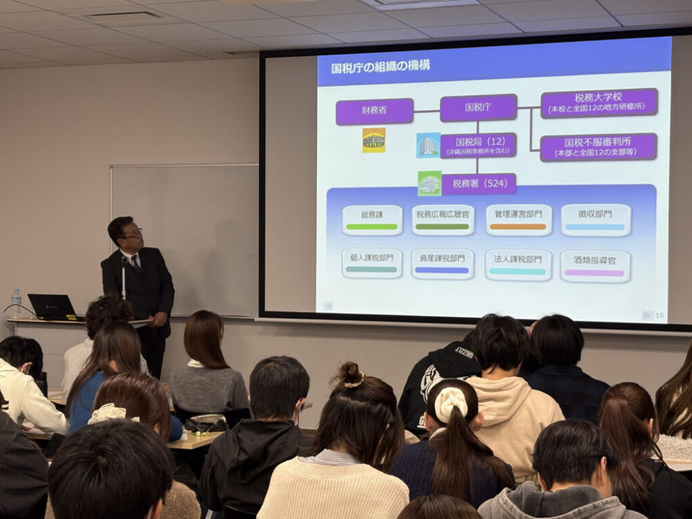 講演は、「これからの社会に向かって - 納税が私たちの生きる『未来』につながる」と題し、税の役割や分類、所得税・法人税・消費税の概要や税の重要性について、丁寧に解説いただきました。また、税務行政のスローガン「正直者には尊敬の的・悪徳者には畏怖の的」に基づき、適正な納税者からは信頼を得ること、悪質な納税者に対して適正な調査を実施する国税組織のあるべき姿をご紹介いただきました。学生たちにとっては、自身の将来にも関わる重要なテーマで、貴重な学びの機会となりました。