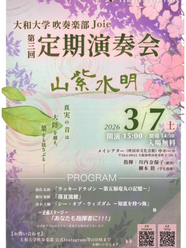 また、吹奏楽部は2025年度の集大成として、来月3月7日(土)15時から吹田市メイシアター中ホールにおいて