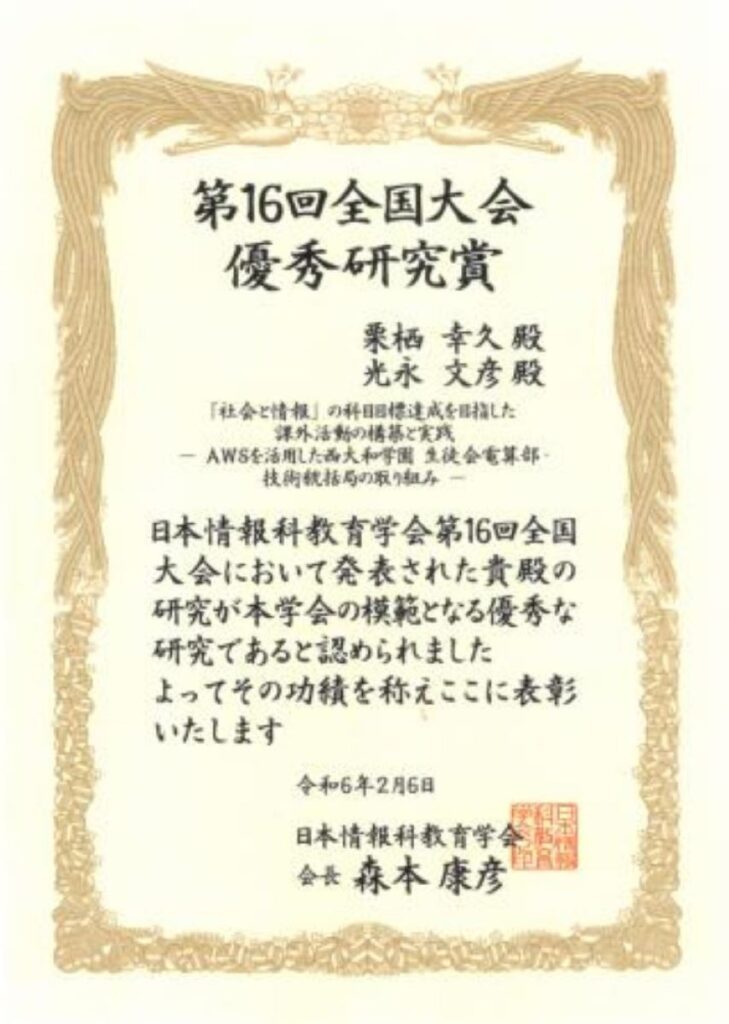 これは2023年 7月に開催された 日本情報科教育学会 第16回全国大会において発表された論文の中から選考され、光永准教授が2023年 3月までに西大和学園中学校・高等学校 情報科教諭・生徒会電算部・技術統括局 顧問として行ってきたコロナ禍における行事配信システムの構築について、中心的に活動した西大和学園高等学校 3年 栗栖 幸久 さんとともに口頭発表し、今後の情報教育の模範となる優れた研究として認められたものです。