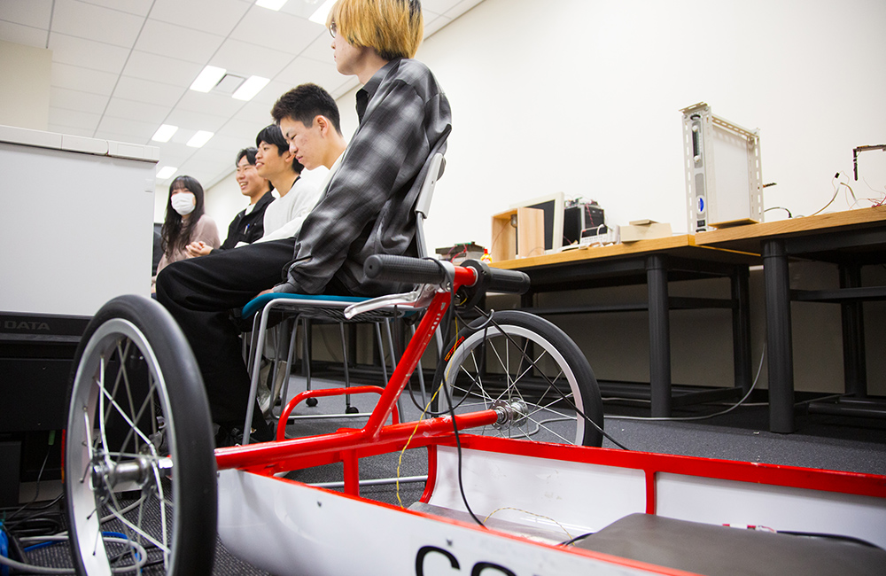 それ、すごくいいね!前回のオープンキャンパスの際、乗れないことがわかった途端に興味をなくす子どもたちが多くて…。ゆくゆくは、遠隔で操作できるブレーキシステムなどを導入し、誰もが気軽に運転できるようにしていきたいです。
